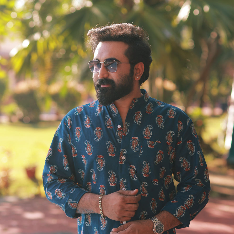 A true celebration of craft, this Indigo Hand-Block Paisley Shirt is a signature piece from Thuni.co. The soft cotton fabric is adorned with an intricate, traditional paisley pattern applied by hand using the ancient technique of block printing. Featuring a classic Mandarin collar and full-length sleeves, this shirt perfectly blends ethnic heritage with a modern fit. It's a statement piece that brings unique texture and artistry to your wardrobe.